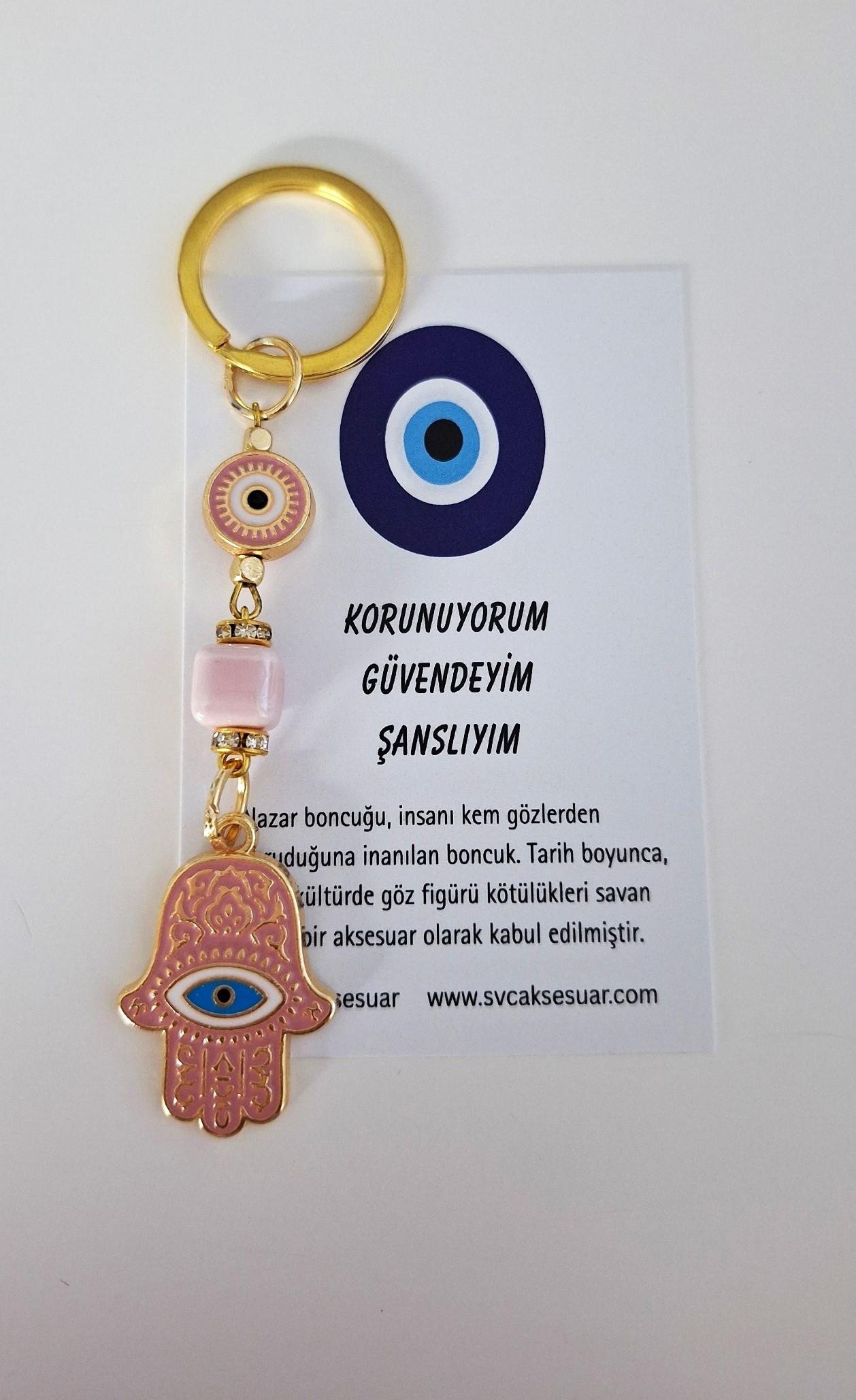 Metal malzeme kullanımı sayesinde dayanıklılık ve uzun ömürlü kullanım sunar; - Pembe renk seçeneğiyle şık ve modern bir görünüm kazandırır; - Nazar boncuğu detayı ile hem koruyucu hem de estetik bir aksesuar olarak dikkat çeker; - 10 cm boyutuyla kolay taşınabilir ve pratik kullanım imkanı sağlar.; İster kendinize alabileceğiniz ister sevdiklerinize hediye edebileceğiniz çok şık bir hediyeliktir.; Kurumsal hediyelik, düğün, nişan, kına gecesi, sünnet, doğum günü gibi özel günlerinizde misafirlerinize hediyelik olarak tercih edebileceğiniz çok şık bir hediyeliktir.; Hediye paketinde ve hızlı gönderim yapmaktayız.