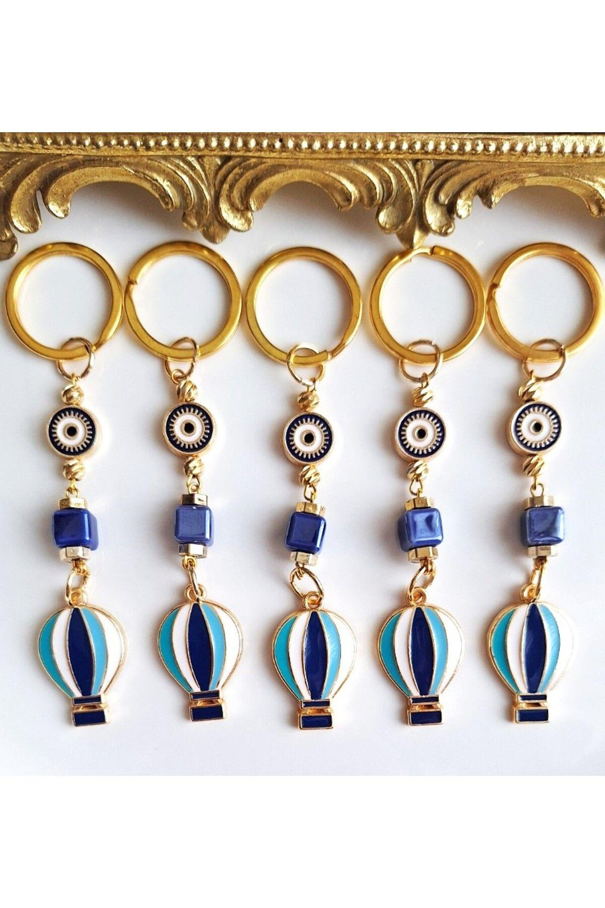 Hediyelik 5'li Nazar Boncuklu Özgürlük Simgesi Balon Detaylı Lacivert Anahtarlık 10,5 cm