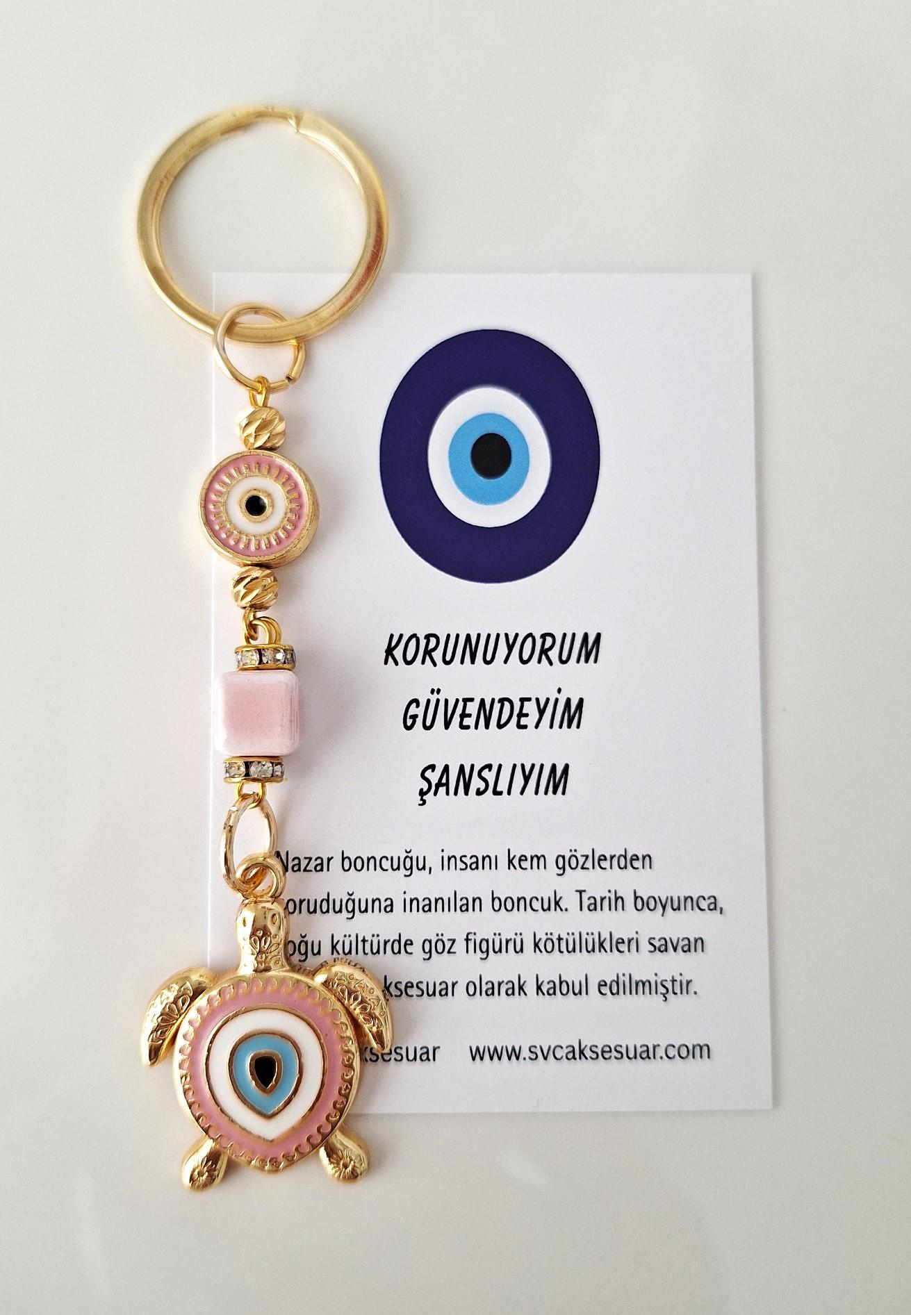 Sevdiklerimize hediye almayı severiz.; Zirkon taş detaylı şık ve kaliteli kaplumbağa detaylı şeker pembe anahtarlık.; Nazar boncuklu olması hediyenize anlam katacaktır.; Nazar boncuğunun tarih boyunca tüm kültürlerde kem gözden koruduğuna inanılır.; Anahtarlık boyu 10,5 cm'dir.; Hediye paketinde ve hızlı gönderim yapmaktayız.;