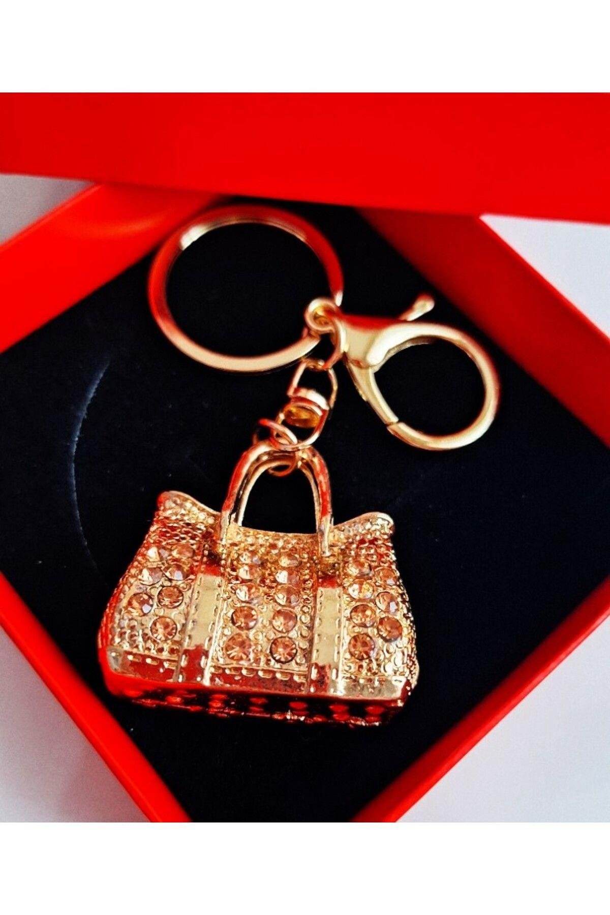 Lüks Hediyelik Altın Rengi Zirkon Taşlı Çanta Anahtarlık - Çanta Süsü - Çanta Charmı