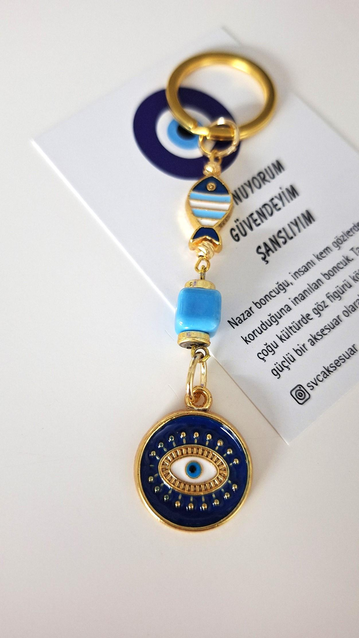 Nazar Boncuklu Hediyelik Şans Balığı Detaylı Koyu Mavi Anahtarlık (10,5 CM)